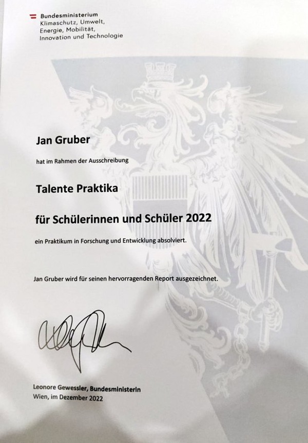 Wie jeder Schüler einer HAK absolvierte auch Jan Gruber in den Ferien ein Praktikum. Aufgrund seiner Interessen entschied er sich für ein Praktikum an der FH CAMPUS 02 in Graz (Automatisierungstechnik). Für die Leistungen im Rahmen des Praktikums und für seinen hervorragenden Report wurde Jan Gruber mit dem „Talente-Praktika für Schüler:innen“ ausgezeichnet.